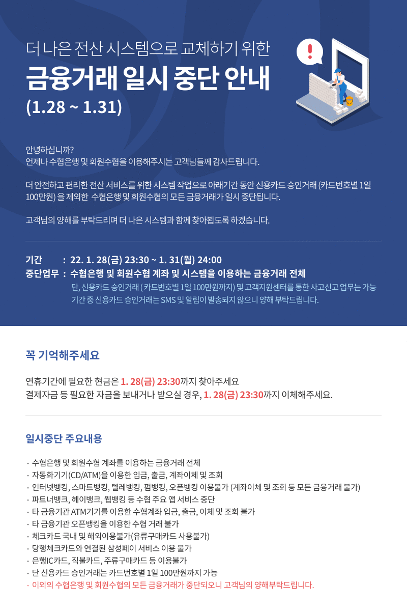 수협은행의 계정계 시스템 전면 교체로 수협은행의 모든 연계업무가 일시 중지 예정이오니 업무에 참고 하시기 바랍니다.